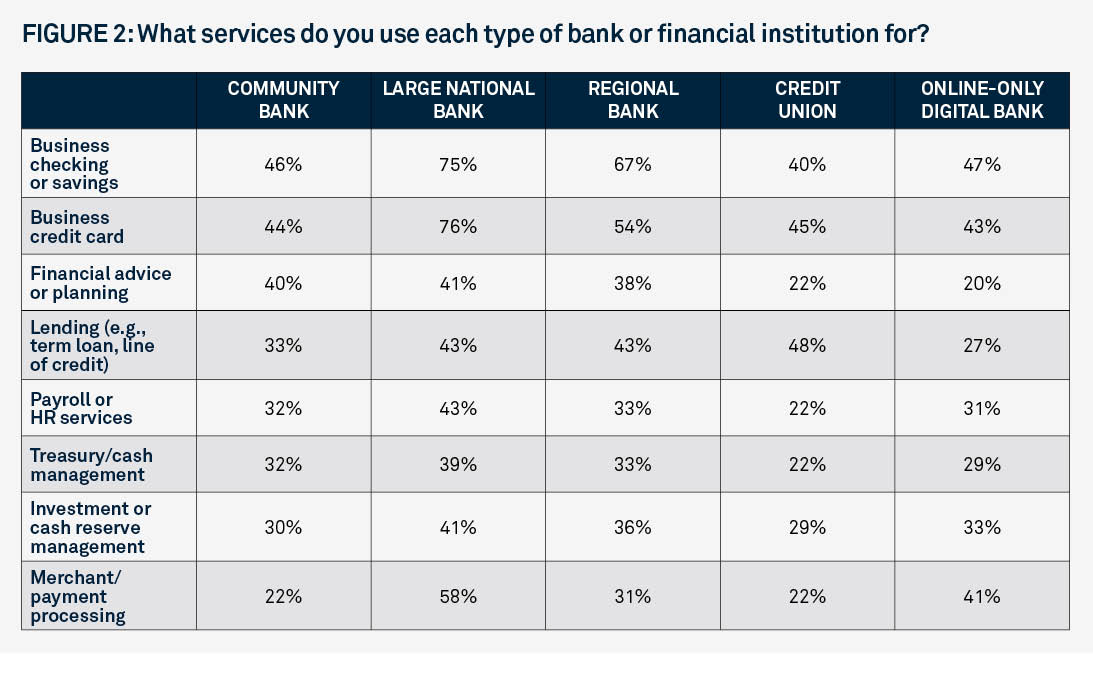 About 30% of the small businesses that participated in our survey currently do business with community banks, and 55% said they plan to begin or expand a relationship with a community bank. This finding presents an opportunity for community banks to capitalize on this increased interest with expanded services and new strategies.