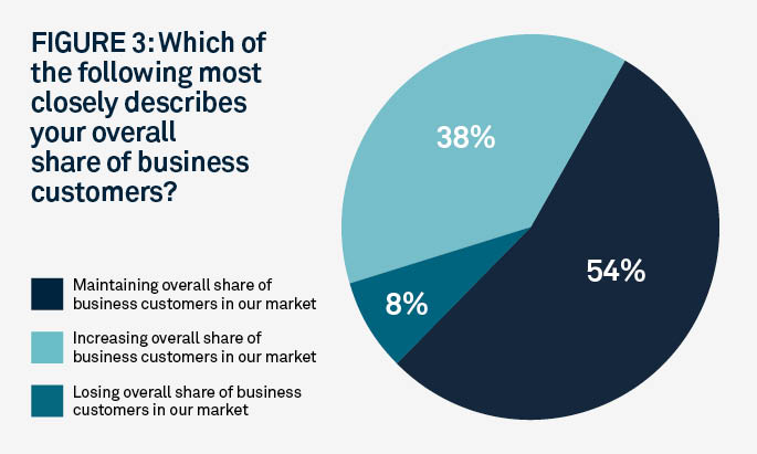 Community banks are always competing for customers, amongst themselves and with other types of banks. To glean insights on potential competitive advantages, we asked community banking executives whether their banks were increasing, maintaining or losing their share of small business customers in their local market. Of our sample, 38% reported they were increasing their overall share of business customers, while 62% were maintaining or losing share.