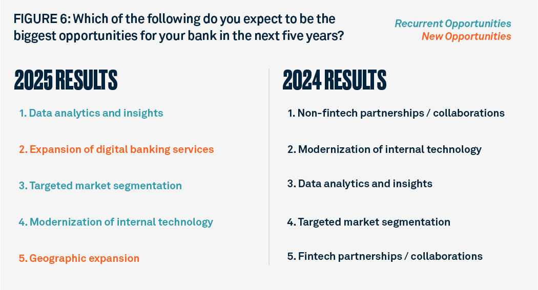 In this year’s study, community bankers selected data analytics and insights capabilities as the biggest opportunity in the next five years, followed by expanding the digital banking services they offer. Focusing on these capabilities can enable the 1 in 5 community bankers who also deem targeted market segmentation and geographic expansion as major opportunities to grow relationships with current customers and capture new relationships in untapped markets.