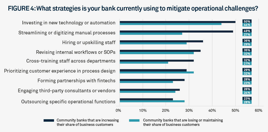 Banks that are growing their small business clientele were also more proactive in mitigating operational inefficiencies compared to their counterparts. Although both groups reported investing in technology and automation at nearly the same rate, banks with increasing small business clients were 81% more likely (49% vs. 27%) to report digitizing manual processes, along with being nearly 50% more likely (32% vs. 21%) to report cross-training staff across departments. Furthermore, banks that were gaining small business customers were 49% more likely to invest in AI for operational efficiency than their counterparts.
