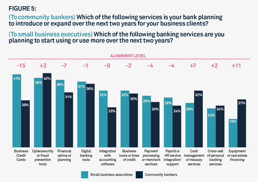 In relation to future services, community banks and small businesses are largely aligned on the need for key offerings like cybersecurity and fraud prevention tools, as well as digital banking tools. Our study found there is one area where community banks are most underestimating a growing need amongst their small business clientele: business credit cards.