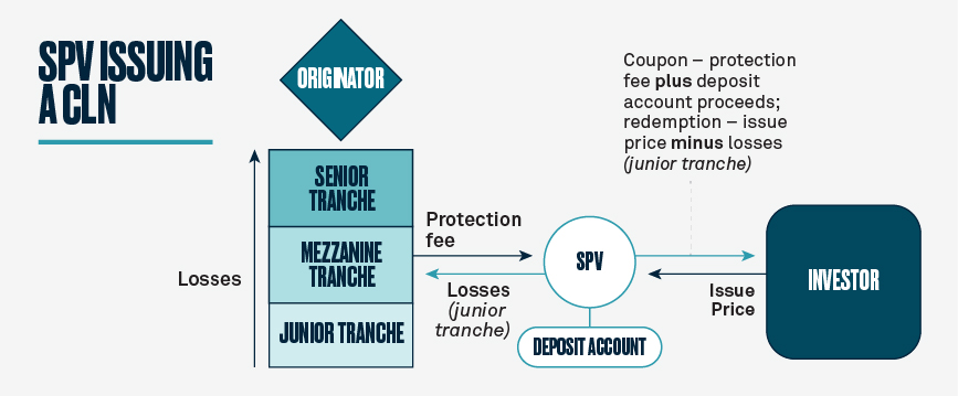 In these transactions, the originator transfers credit risk via a CDS or a financial guarantee to an SPV – which may be affiliated with the originator or could be an orphan SPV. In turn, the SPV issues CLNs to investors to finance the collateral it needs to post to the originator to support its first loss protection undertaking to the originator. This approach is widely recognized as capital‑efficient and compatible with Basel III requirements, though additional capital may be required where deposit‑bank exposure is introduced.