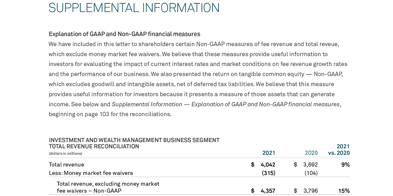 In the fourth quarter of 2021, we began reporting our financial performance along new business segments — Securities Services, Market and Wealth Services, and Investment and Wealth Management — that align closer to how we manage the firm. Our new segmentation further highlights the breadth of our businesses, which is a true competitive differentiator, and enables you to track our performance against our strategic priorities at a more granular level going forward.