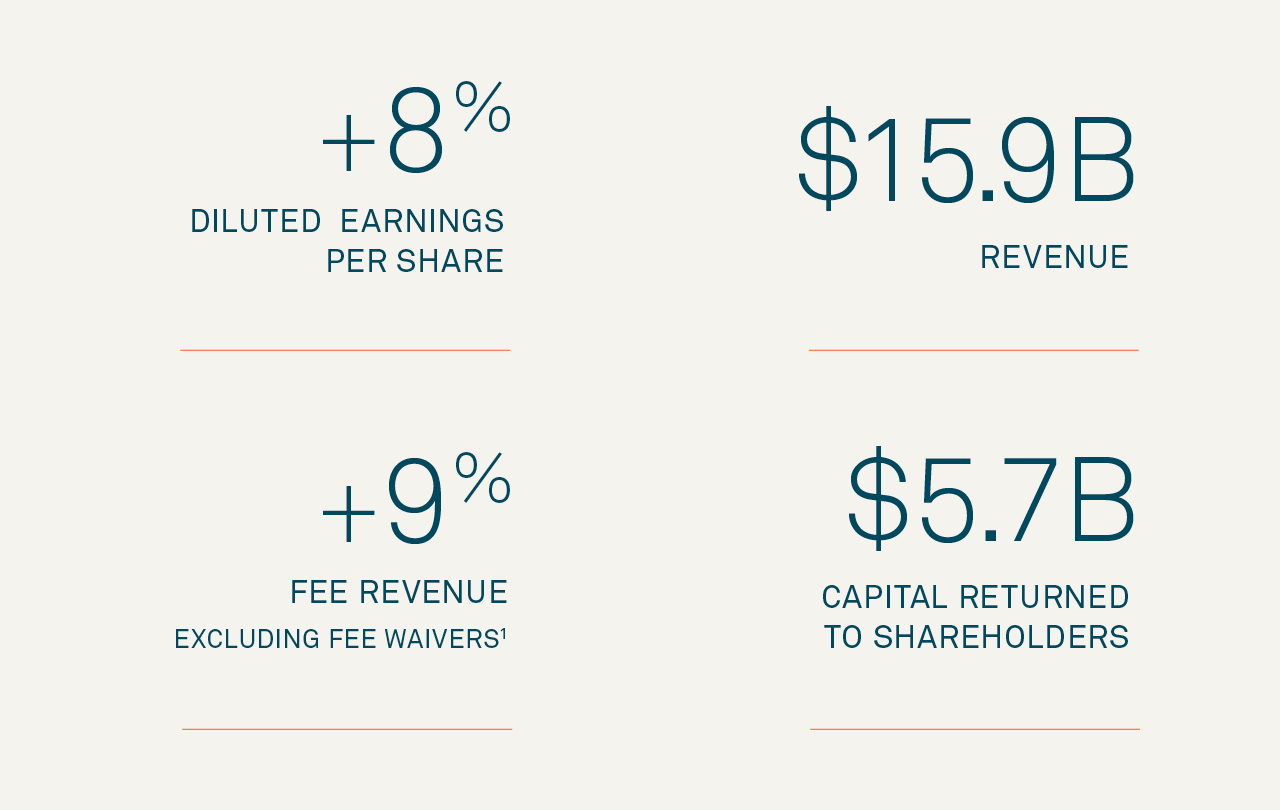 Revenue of $15.9 billion was up 1%, as the benefit of higher equity markets and accelerated organic growth more than offset the negative impact of lower interest rates on net interest revenue and fee revenue in the form of higher money market fee waivers. Fee revenue was up 4%, or 9% excluding the impact of fee waivers,1 highlighting the strong and broad-based underlying growth across our businesses. We are also very pleased with the performance of our strategic equity investments. Our solutions-oriented investments and strategic alliances with Fintechs continued to drive efficiency and offer more powerful solutions for our clients. They are yielding compelling financial returns, as well.