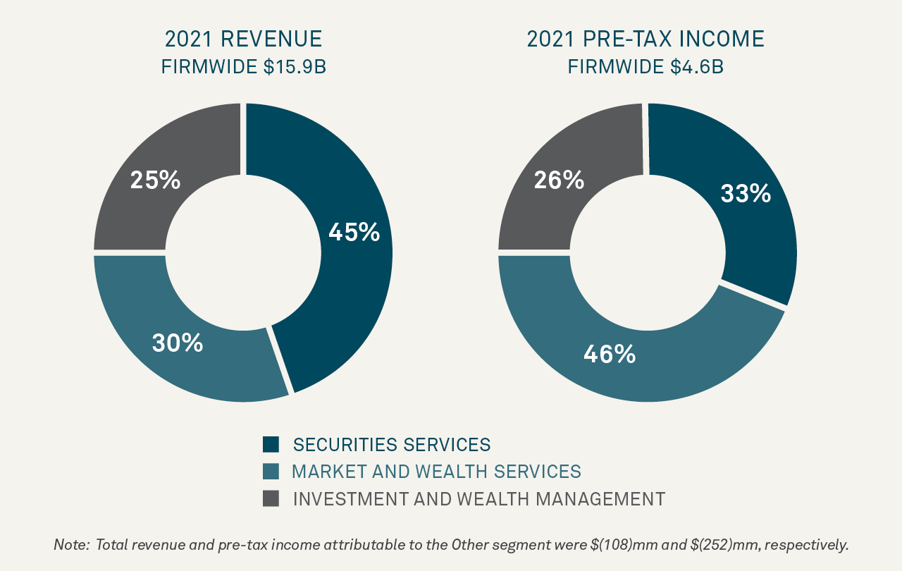 Market and Wealth Services comprises industry leaders Pershing and Clearance and Collateral Management, and our scaled Treasury Services business. Our highest-margin segment, it produced roughly 30% of the firm’s revenue but over 45% of the firm’s pre-tax income in 2021.