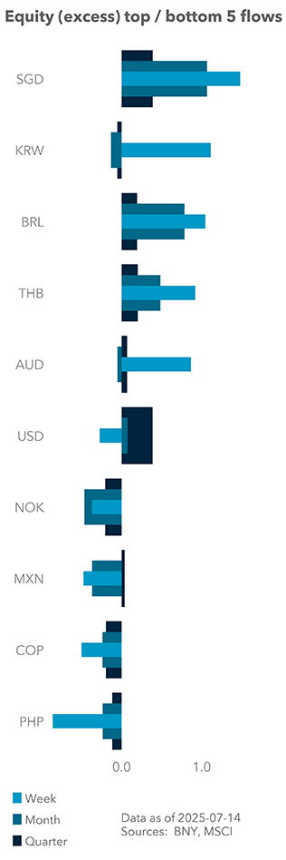 The EUR appears to have topped out, as markets are wary of a tail risk of a more dovish than anticipated outcome from next week’s policy decision. Our data show that cross-border hedges in the EUR continue to grow, and current valuations are advantageous to lock in. However, the changes may also reflect sustained positive performance in developed European equities. Due to the prevailing “U.S. exceptionalism” investment thesis seen over the last few years, cross-border investors have been underweight European equities but the new investment/domestic-demand narrative has changed proceedings. We find that relative to combined client base (cross-border and local) holdings (Exhibit #2), the sectors with the largest over-allocations are clearly areas with the most to gain from stronger domestic demand and linked to defense, such as industrials and IT. Consumer discretionary and energy are also performing well, which also speaks to a stronger growth narrative. However, these are areas where the absolute levels of holdings are weak across all client segments.