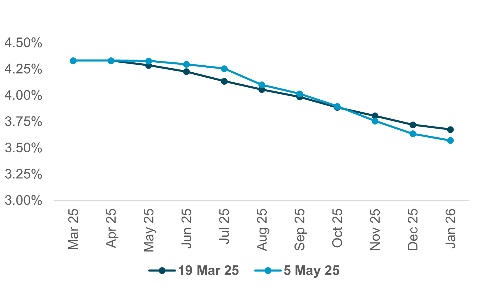 Going forward, we maintain our view that as long as the tariff regime as announced remains the same, the economy will indeed soften. April payrolls beat expectations at 117k new jobs, well in excess of the 13k consensus expectation. The survey period was the week following “Liberation Day,” so it’s likely that any labor market reaction to the announcement was not picked up, meaning we’ll have to wait a month or two for confirmation of a slowdown. Our view is that by the time the June data are published in early July, the jobs outlook will start to deteriorate clearly, allowing the Fed to cut rates at the end of that month.