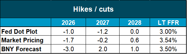 As noted, we expect no rate move at the January FOMC this week. However, we maintain a more dovish view than the market for later in 2026. We continue to expect three cuts, likely in the second half of the year. This contrasts with market expectations of just under two cuts and the Fed’s most recent dot plot showing only one.