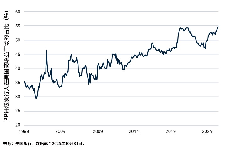 以数据为证:截至2025年10月,BB评级发行人在美国高收益市场的占比已从1999年的35%攀升至54%以上(见图3)。