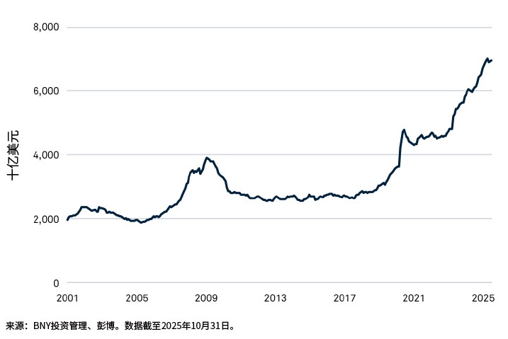 自全球金融危机后的多年间,美国货币市场基金规模始终稳定在约3万亿美元水平。但随着美联储2022年初启动加息周期,截至2025年中,该规模已达7.4万亿美元,期间累计增长2.3万亿美元(见图5)。