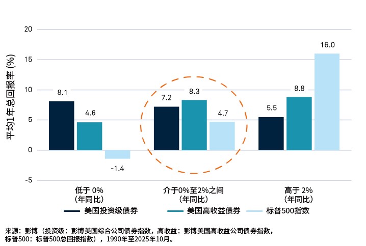 历史数据显示,当经济增长率处于0%至2%区间时,信用债(特别是高收益债券)往往能取得良好表现(见图7)。