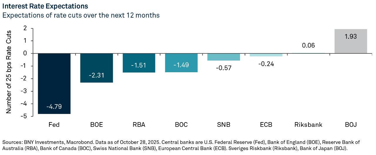 Meanwhile, after lowering rates five times since August 2024, the Bank of England is navigating stubborn inflation and wage growth, so it may take a more cautious approach. Markets anticipate two rate cuts over the next year.