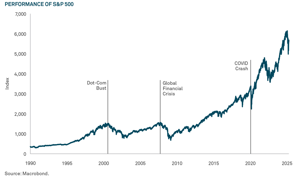 In each of the three market crises we’ve addressed, bond yields fell as investors sought the safety of fixed income. For example, during the GFC, the 10-year U.S. Treasury yield, which stood above 5% in mid-2007, fell to below 2.5% by the end of 2008. Yields remained below 4% for most of the next decade, as the Federal Reserve maintained ultra-accommodative policies to support the economy.6