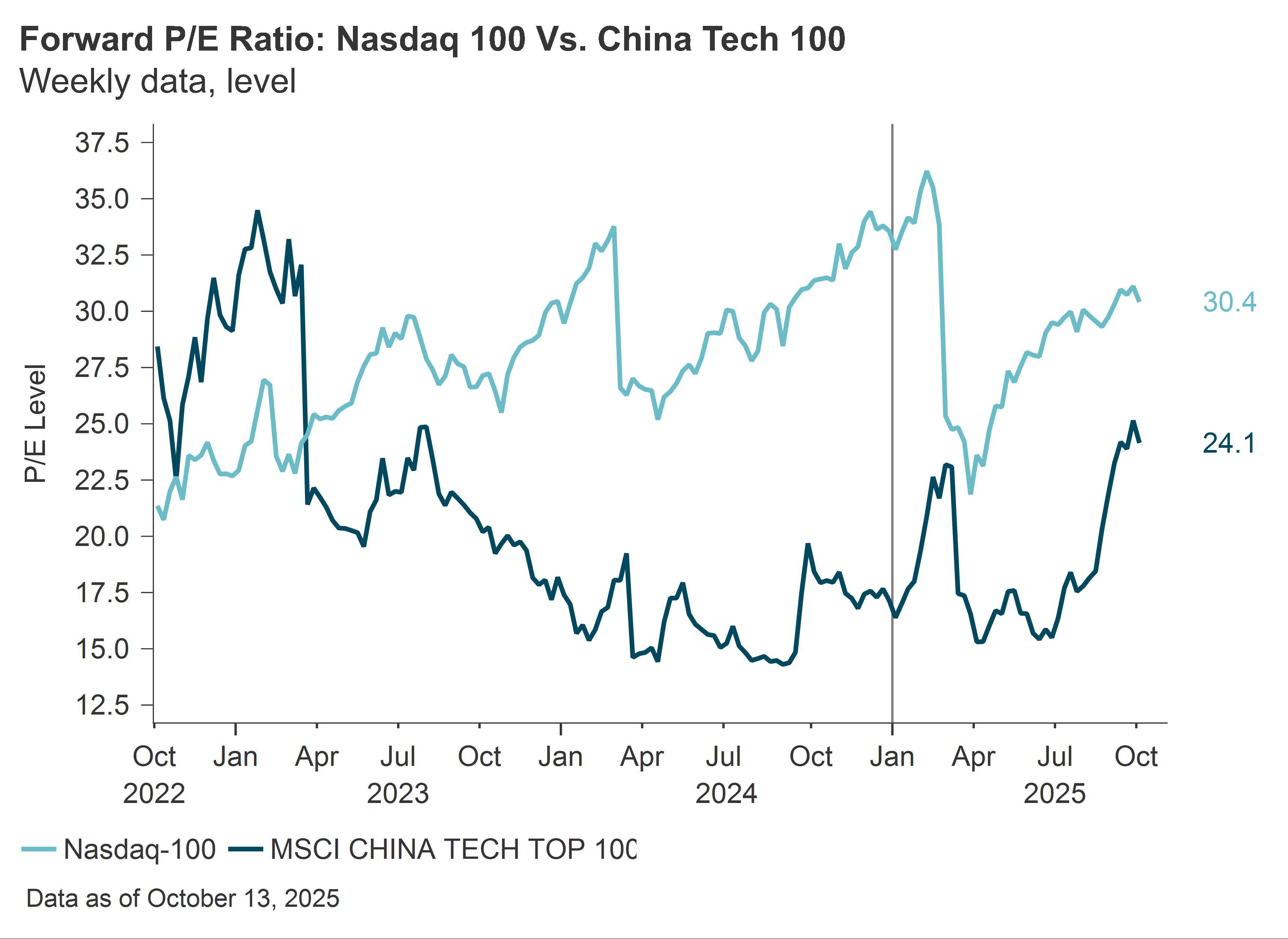 Figure 4: Technological breakthroughs and signs of narrower capability gaps have helped Chinese equity multiples but stable economic relations with the U.S. and lower deflation is still needed.