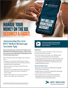 Options trading involves significant risk and is not appropriate for all investors. You must receive from BNY Mellon Securities Corporation the latest copy of Characteristics and Risks of Standardized Options before you invest. Contact us to be approved for options trading. Before enrolling in the BNY Brokerage Account, please read the BNY Brokerage Account Client Agreement and Related Disclosures, and Fee and Commission Schedules.