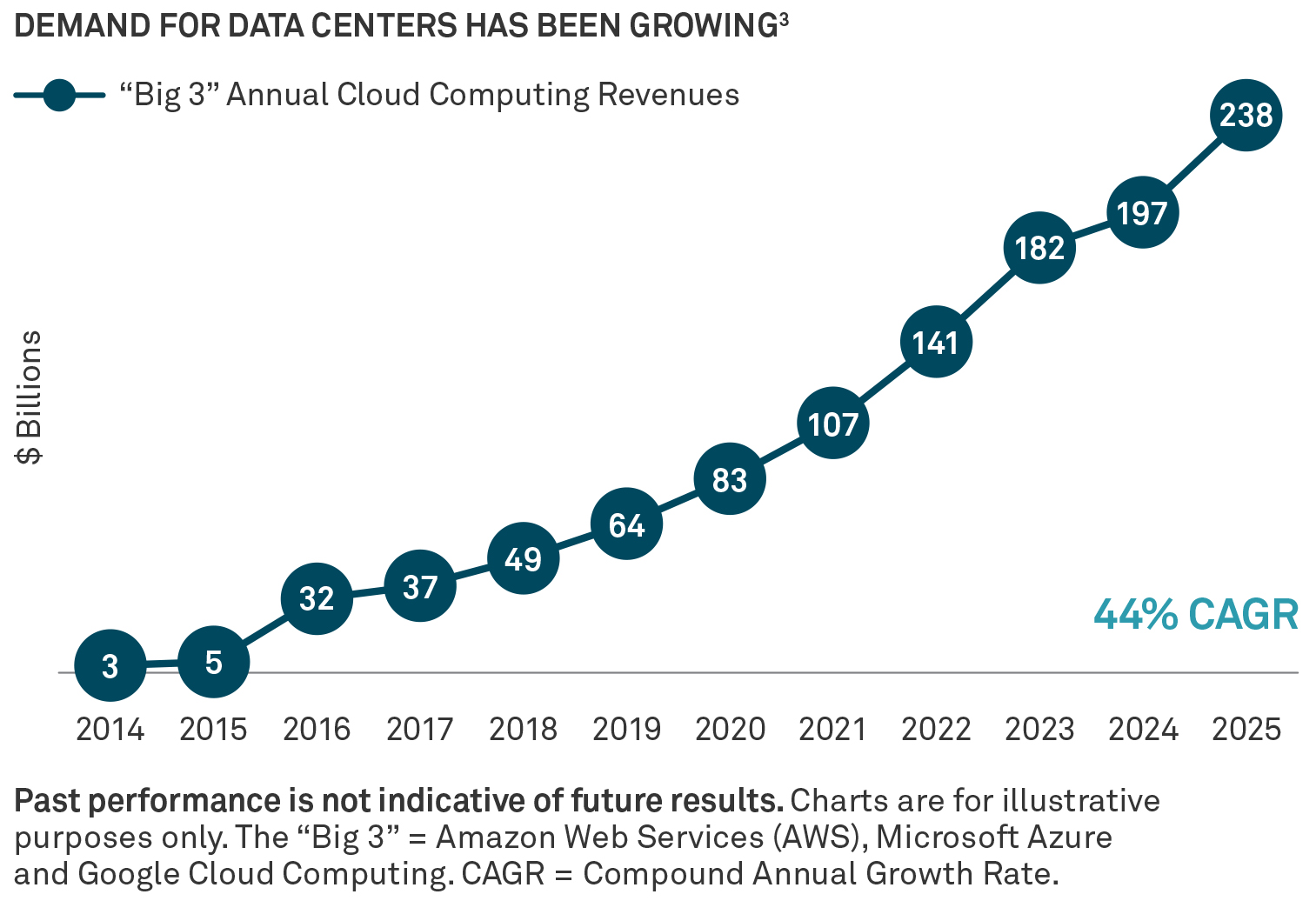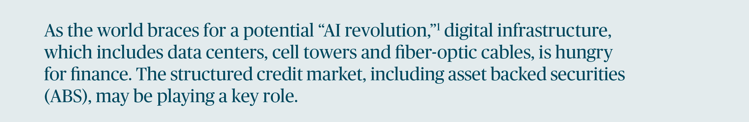 Cloud computing has been a key driver of the data center build-out in recent years. As 89% of large businesses embark on digital and AI transformations, migrating in-house computing systems to cloud providers has become a key step.2 Companies can lease anything from data center shelf space (known as retail “colocations”) to entire buildings (known as “hyperscale” data centers). Asset-backed securities (ABS) deals tend to be secured against leases from multiple tenants and other assets while commercial mortgage-backed securities (CMBS) deals tend to be secured against a single borrower’s mortgage on a hyperscale property.