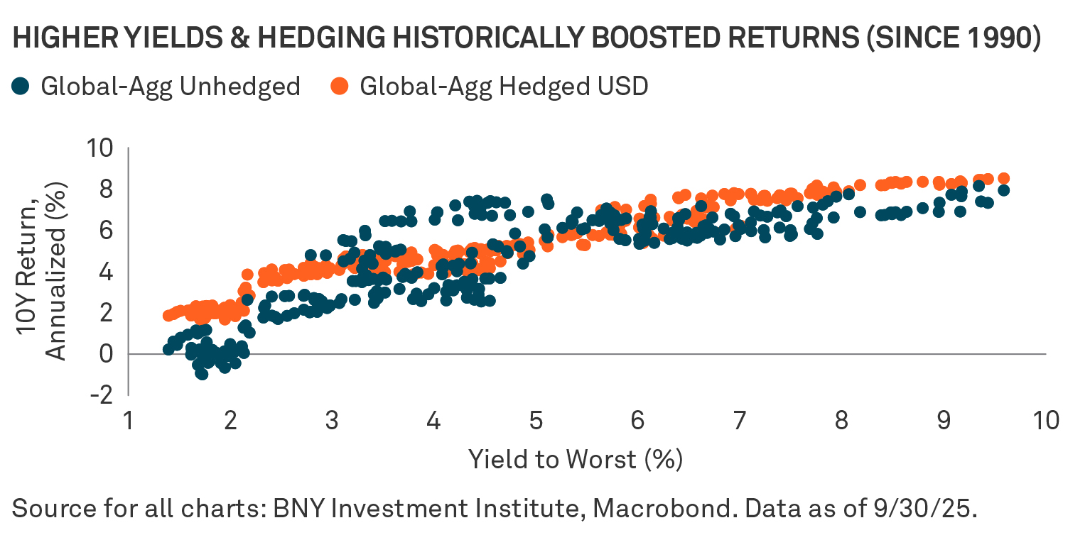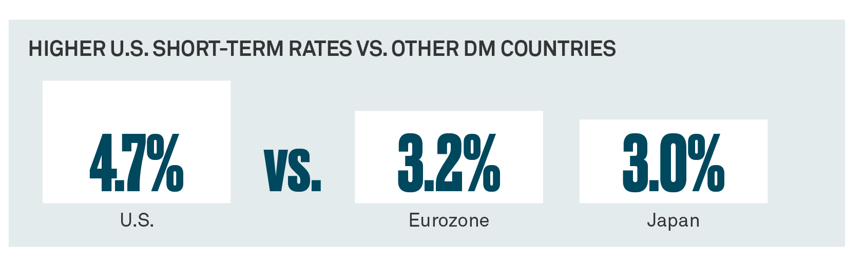 Higher U.S. short-term interest rates compared to DM peers could enable investors to gain additional yield by hedging currency risk. The interest rate differential may reduce income volatility while providing potential for foreign bond duration returns. U.S. investors who hedge their currency exposure can gain a yield increase roughly equal to the interest rate differential between the two countries.