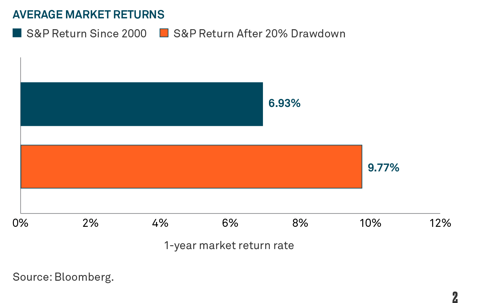Taking a step back to examine the S&P 500 more broadly, we see that since 2000, average market returns are just under 7%. However, since 2000, the average 1-year return after periods of a 20% drawdown are more than 9.7%.5