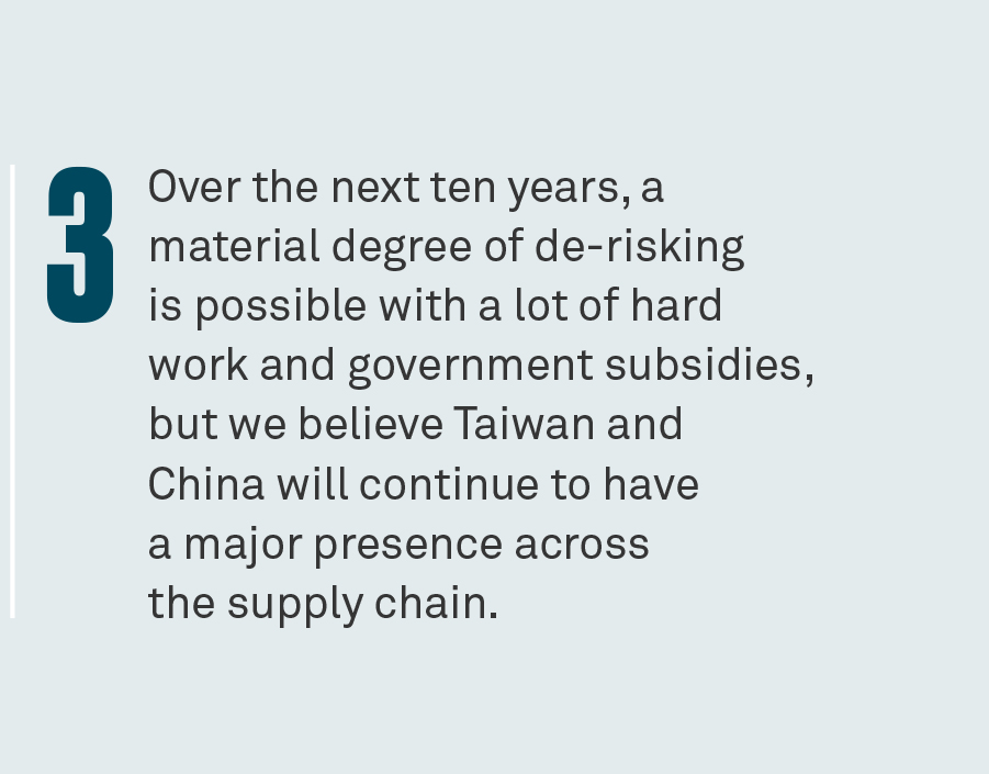 On the current trajectory, some 34% of leading-edge fabrication is scheduled to happen outside Taiwan and China by 2027.2 This will enable Nvidia to say that some of its chips are made in the U.S. Apple will be able to tell its U.S. customers that some of its phones are made in India rather than China. But in truth, this will be akin to a veneer of de-risking; Western companies will still be heavily dependent on Taiwan and China. Even on a ten-year horizon, while a more material degree of de-risking is possible with a lot of hard work and plentiful government subsidies, we believe both countries will continue to have a major presence across the supply chain.