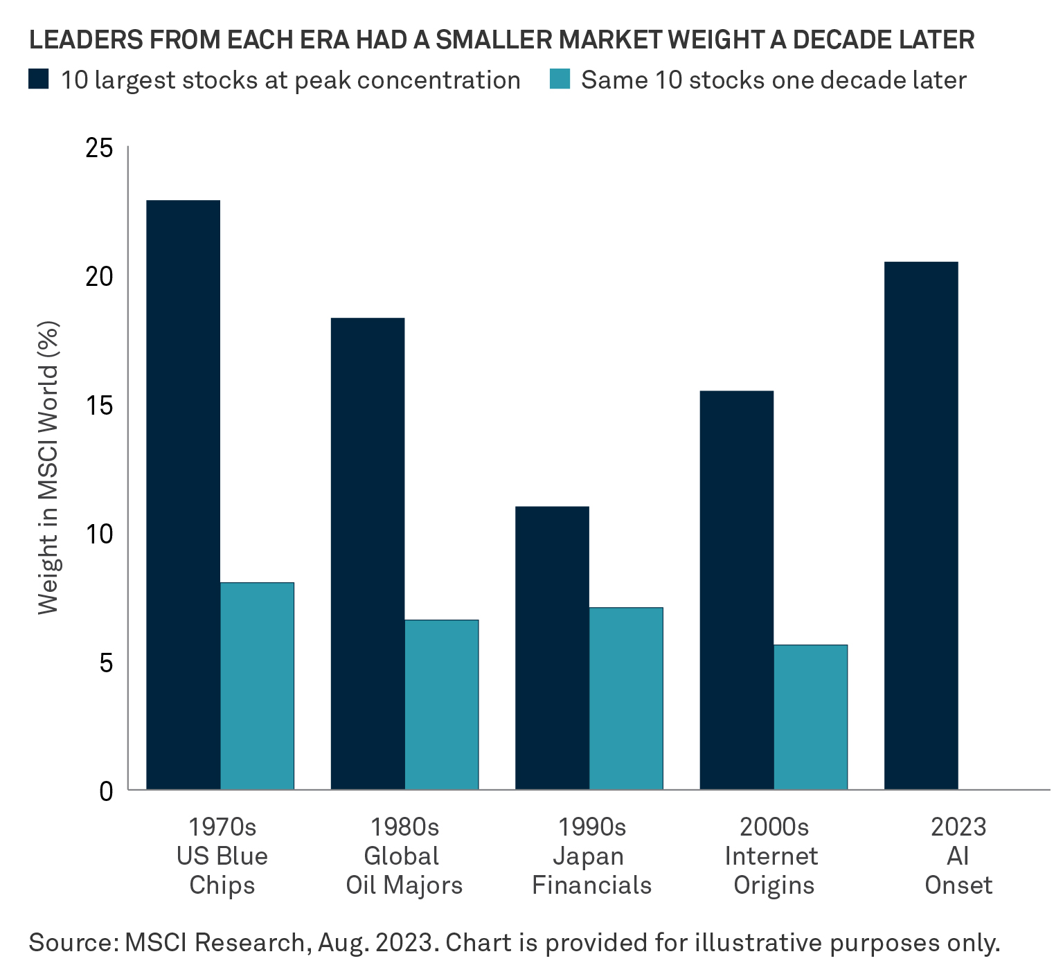 We do not see such concentration often but there is market precedent. From the established blue-chip giants of the 1970s to the mobile telecommunications and internet companies of the early 2000s, stock markets have experienced periods where a select few companies have held significant dominance. However, as the chart shows, these eras of market concentration rarely last.