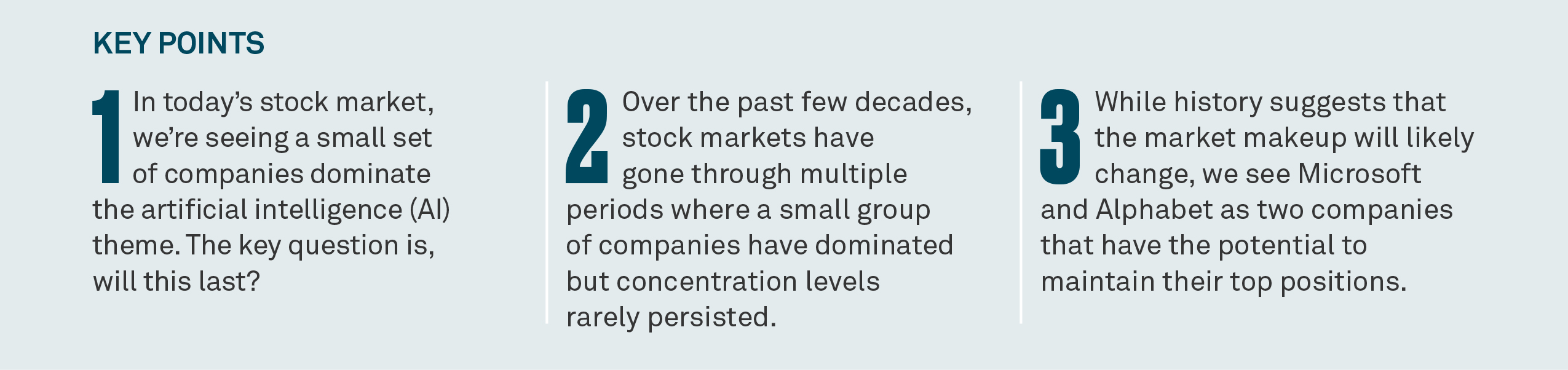 It’s still very early days for AI and progress is rarely linear. While we believe many of today’s market leaders will likely continue to play an important role in the AI ecosystem for decades to come, history suggests that recent concentration levels are unlikely to persist. As investors, we look beyond just current market momentum, and instead evaluate companies on an individual basis.