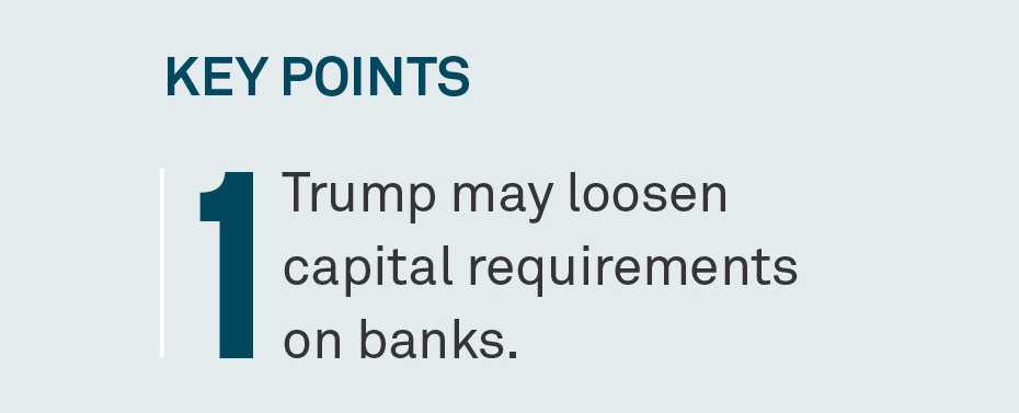 The banking sector is expected to come under Trump’s deregulatory lens. Prior to Trump’s inauguration, the Federal Reserve (the Fed) announced a cut to a proposed increase to capital requirements under the Basel III regulation.2 But we think there is a possibility that the Trump administration could water this down further.3