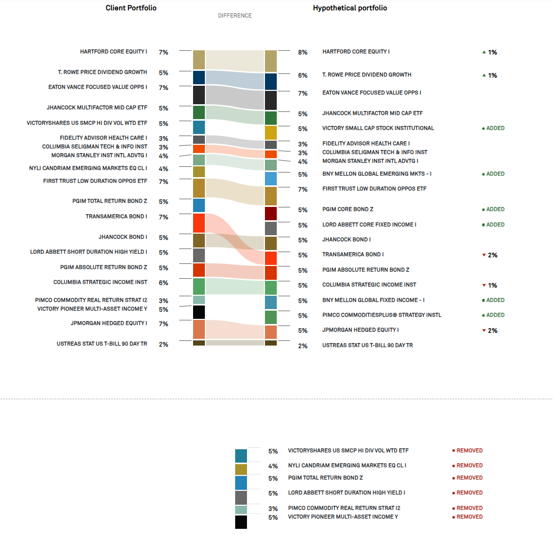 Dynamic, interactive, visual charts that summarize the changes between current and hypothetical portfolios, packaged for you in your report.
