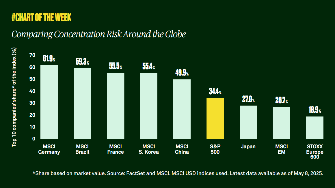 However, when comparing the weight of the top 10 U.S. stocks to equity concentrations abroad, concentration becomes less worrisome. The top 10 stocks of Germany, Brazil, France, South Korea and China, respectively, constitute 50% or more of each country’s equity index. The 34.4% concentration of the top 10 stocks in the S&P 500 appears less of a concern in comparison. In addition, the concentration in other regions like Japan and Emerging Markets is only marginally lower at 27-28%.