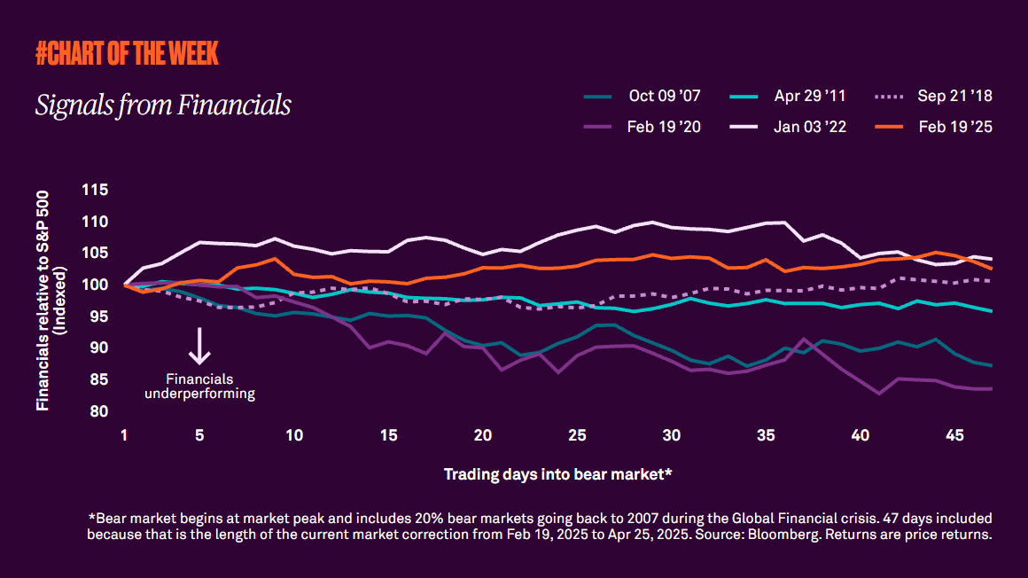 Historically, the worst bear markets coincide with credit crises—times when financials underperform. However, the recent stability of financial stocks suggests that the market has not been pricing in the possibility of a credit crisis.