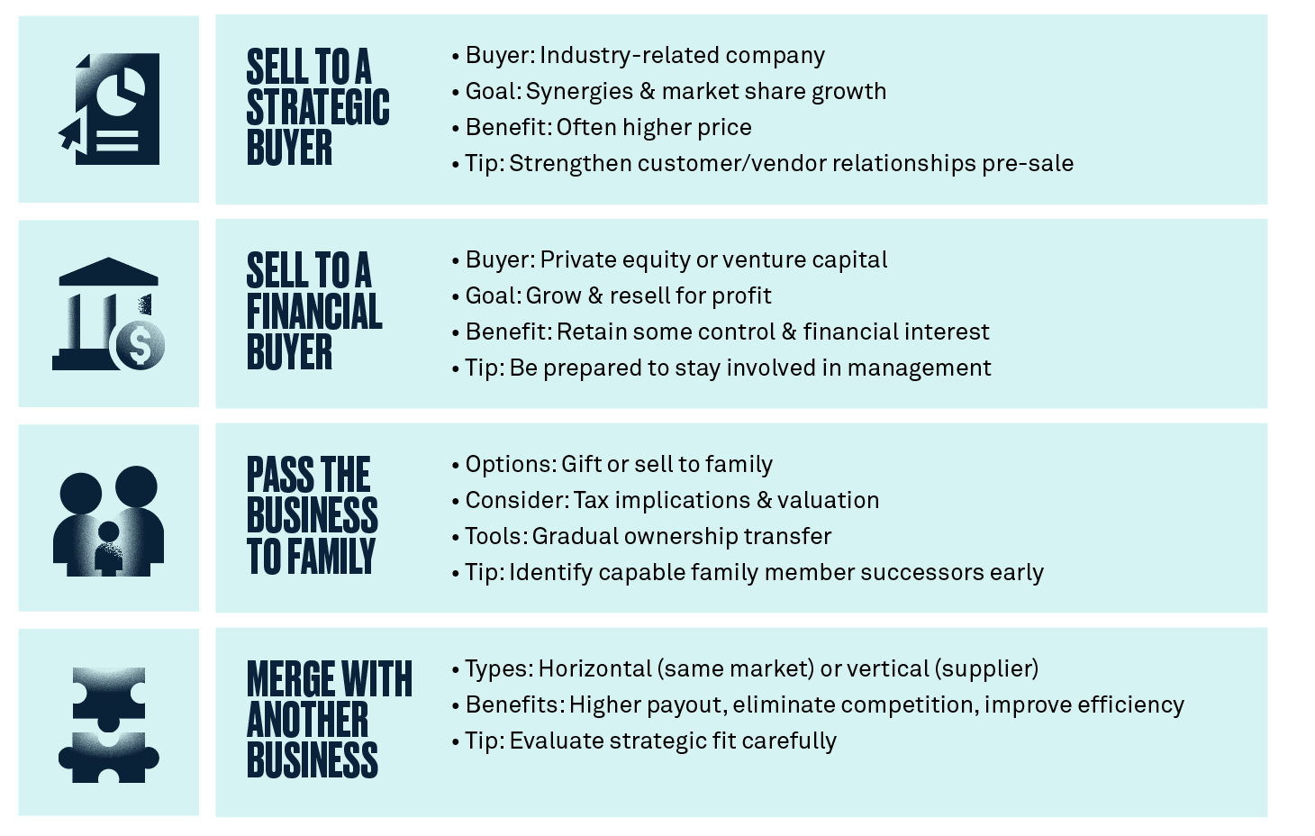 Regardless of the reason, owners have several options for how they will exit their business. Here are four different types of business exit strategies: